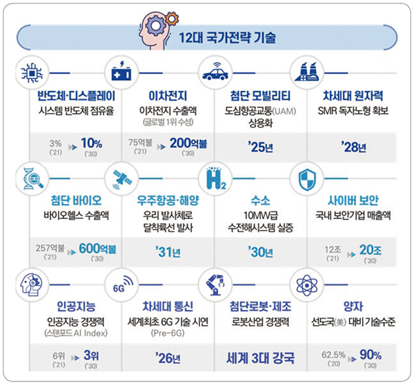 정부에서는 국가전략 기술 육성을 통해 미래 성장과 기술 주권을 확보하기 위한 목적으로 2022년 10월 국가 12대 전략기술 육성 방안을 발표하였다. 글로벌 5대 기술 강국으로 도약하기 위한 범부처 민관합동 대형 프로젝트인 12대 국가 전략기술은 아래와 같다.