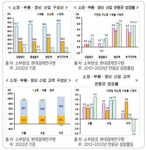 최근 수년간 미ㆍ중 갈등, 한ㆍ일 갈등, 글로벌 공급망 불안, 반도체와 배터리 등 주요 상품 자국화 및 경쟁 심화 등으로 소부장 산업(소재ㆍ부품ㆍ장비 산업 총칭, 이하 동일)의 중요성이 그 어느 때보다 커졌다. 지난 2001~2020년까지 20년간 국내 소부장 산업의 생산액과 부가가치액은 연평균 6% 이상 성장했다. 특히, 부품 산업은 생산액과 부가가치액이 각각 7.4%씩 증가해 왔으며, 전체 소부장 산업의 생산액과 부가가치액에서 차지하는 비중이 각각 60.1%, 68.5%로 성장을 주도해 왔다. 교역 역시 부품 산업이 소부장 산업 전체 수출의 62.7%, 수입의 57.8%, 무역수지 흑자의 74.5%를 차지할 정도로 의존도가 높다.