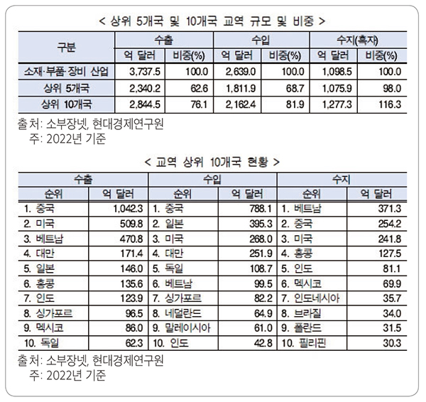 • (상위 5개국에 수출과 수입의 60% 이상 의존) 2022년 기준 국내 소부장 산업의 전체 수출과 수입은 상위 5개국에 60% 이상을 의존하며, 무역수지 흑자의 약 98% 정도를