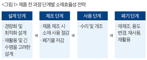 전 과정 평가, 친환경 설계 등 기업과 정부가 소재효율성을 측정하고 개선하는 데 도움이 되는 다양한 평가 방법과 도구 개발이 필요하다. 소재효율성 측정은 원자재 추출부터 제품 폐기에 이르기까지 전체 생산공정에서 원자재 또는 재료의 사용을 추적해야 하므로 복잡할 수밖에 없다. 유럽표준화위원회(European Committee for Standardization)는 소재효율성을 위한 에코디자인을 지원하기 위해 제품 내구성, 수리 가능성, 재활용 가능성 등의 평가 및 측정 방법을 개발하였다. 이러한 제도적 기반 마련은 장기적 관점에서 소재경쟁력 강화와 녹색성장을 위해 필수적이다.