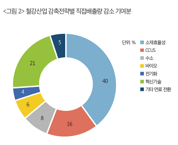 철강산업은 전 세계 온실가스 배출량의 7~9%를 차지하는 산업 부문의 가장 큰 탄소 배출원 중하나다.6) 철강산업에서 소재효율성을 개선하면 상당한 탄소 감축효과가 예상된다. 국제에너지기구(International Energy Agency) 보고서7) 에 따르면 철강 부문의 탄소 배출을 줄이기 위한 핵심전략 중 하나로 소재효율성을 제시하였다. 소재효율성 전략은 전 세계 철강 수요 증가를 줄이는 동시에 동일한 제품 및 서비스를 제공할 수 있음을 강조한다. 보고서 내 지속 가능한 개발 시나리오에서는 소재효율성 전략을 통해 2050년의 철강 수요는 기존 정책 시나리오 대비 19% 감소가 기대되며, 2020~2050년 누적된 직접배출량의 감소 기여분은 40%로 추정된다.