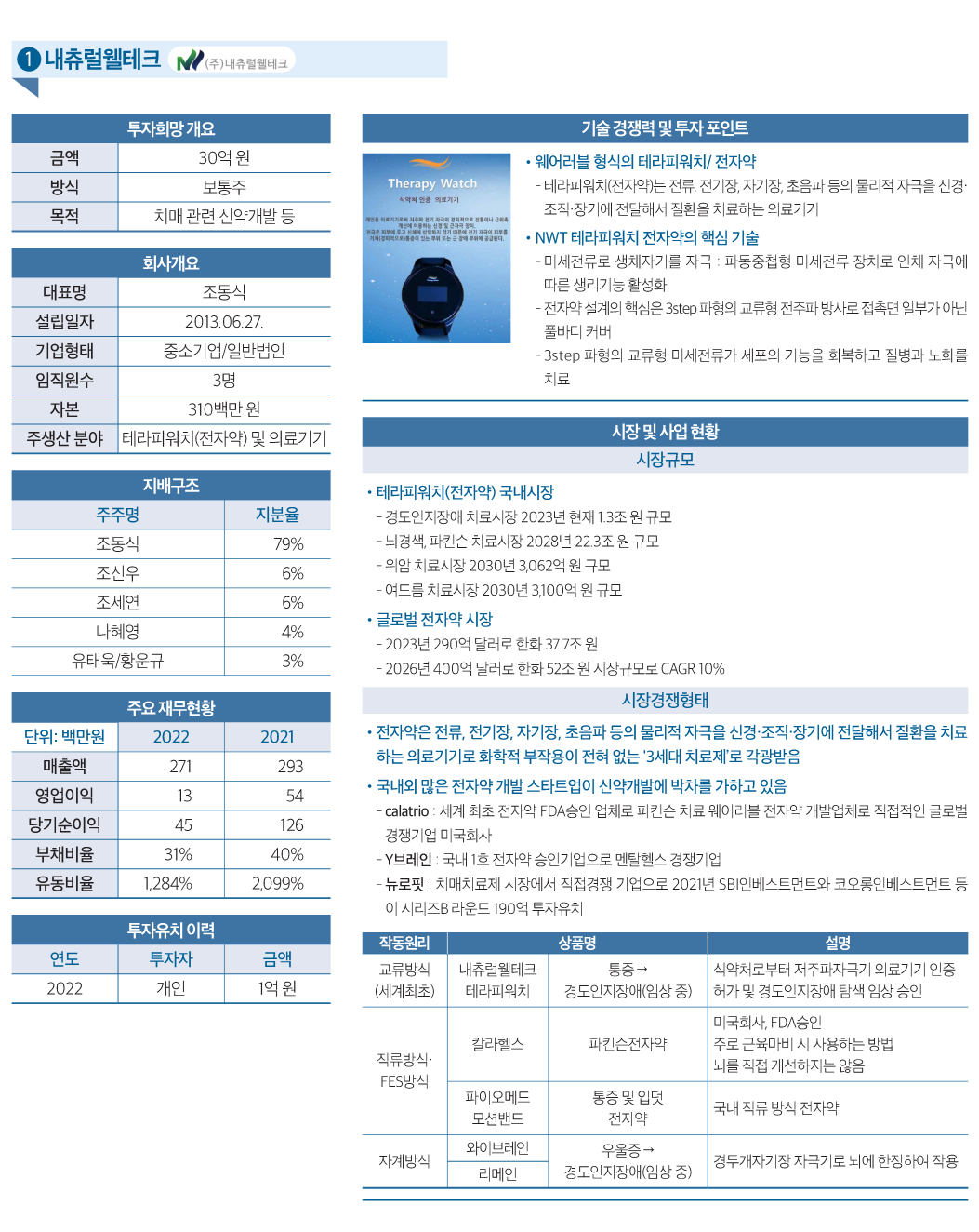 | 1 | 내츄럴웰테크 | 테라피워치(전자약) 및 의료기기 | 30억 원 | 보통주 |