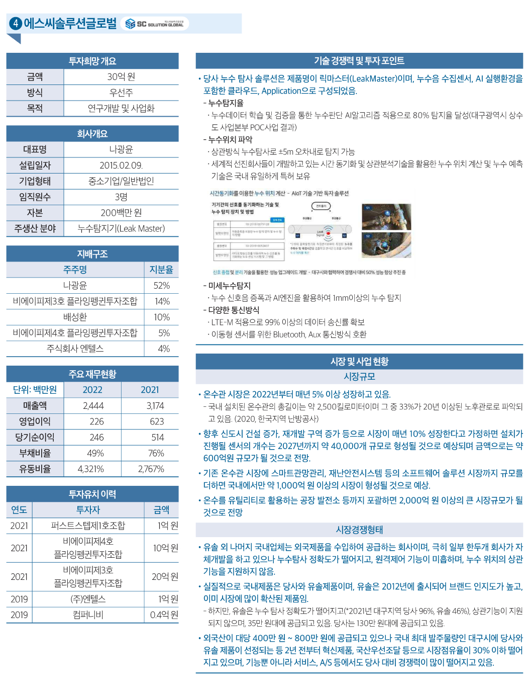 | 4 | 에스씨솔루션글로벌 | 누수탐지기(Leak Master) | 30억 원 | 우선주 |