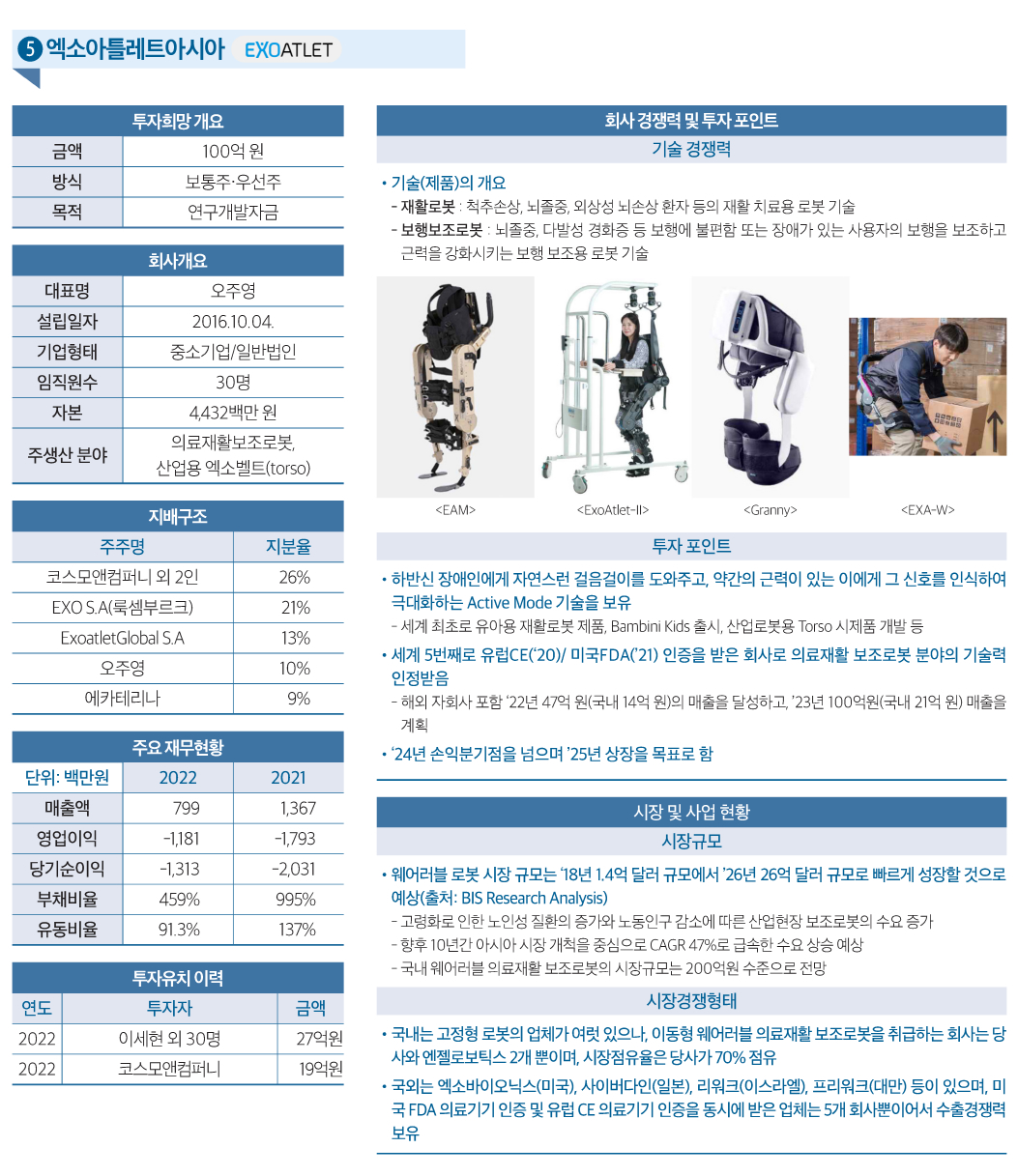 | 5 | 엑소아틀레트아시아 | 의료재활 보조로봇, 산업용 엑소벨트 | 100억 원 | 보통주·우선주 |
