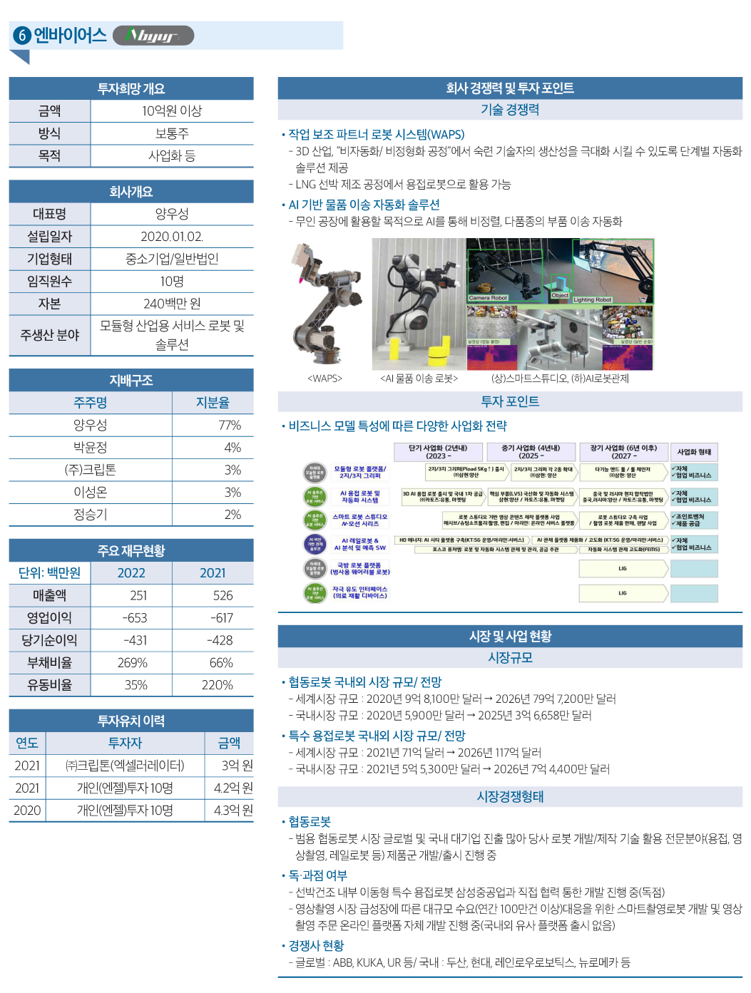 | 6 | 엔바이어스 | 모듈형 산업용 서비스 로봇 및 솔루션 | 10억 원 이상 | 보통주 |