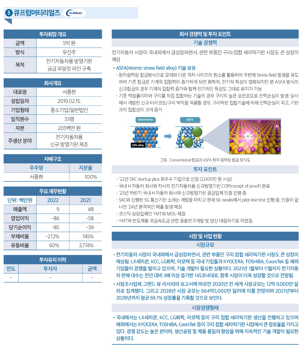 | 8 | 큐프럼머티리얼즈 | 전기자동차용 신규 방열기판 | 5억 원 | 우선주 |