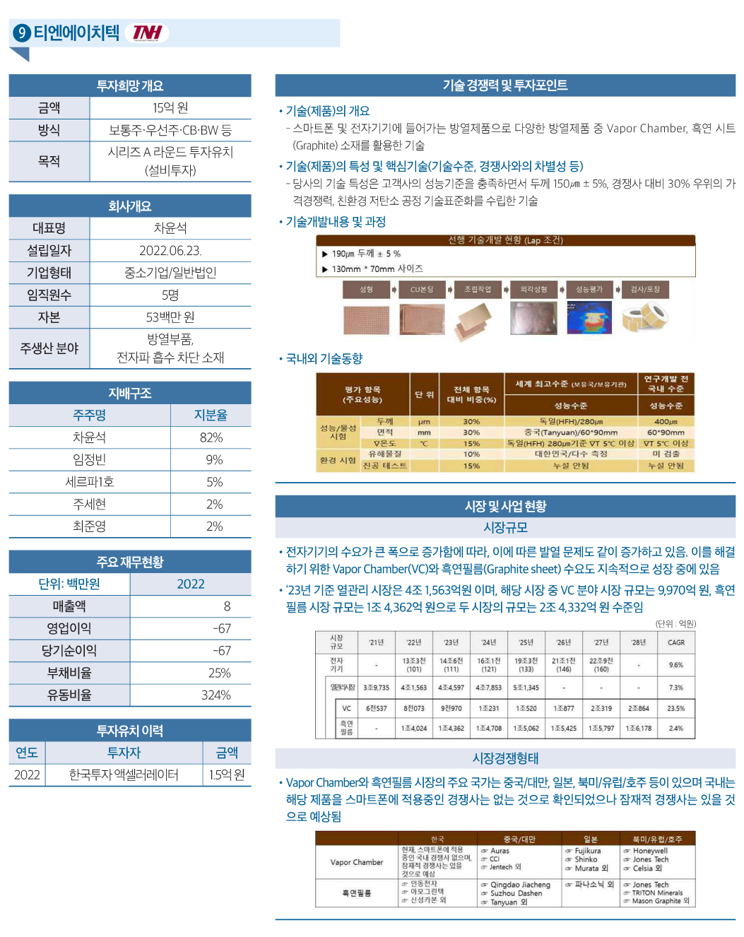 | 9 | 티엔에이치텍 | 방열부품, 전자파 흡수 차단 소재 | 15억 원 | 보통주·우선주·BW 등 |