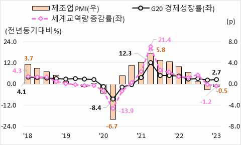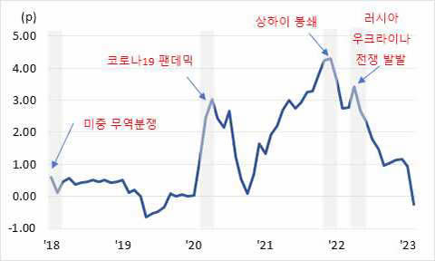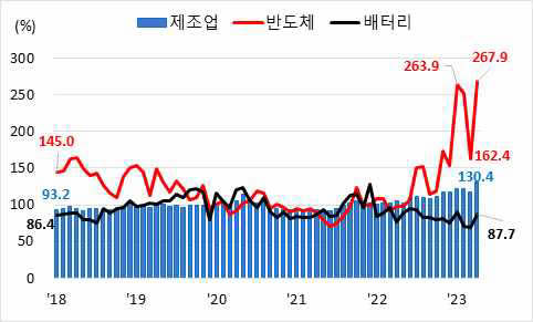 • 2022년 하반기 이후 세계경기는 교역량 둔화, 제조업 업황 위축 등 에 직면한 가운데 국내 역시 반도체 산업을 중심으로 재고율이 확대되는 등 산업경기의 부진 흐름이 지속