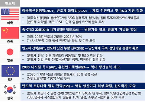 - (한국) 기업투자 지원, 인력 양성, 시스템 반도체 선도기술 확보, 소부장 생태계 구축 등 반도체 초강대국 달성 전략을 수립(’22.7)