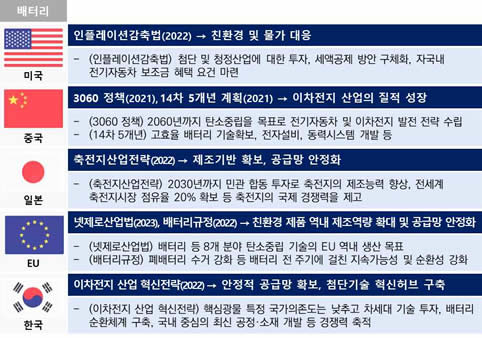 - (한국) 안정적 배터리 공급망 확보, 첨단기술 혁신허브 구축, 생태계조성 등을 목표로 이차전지 산업 혁신전략을 발표(’22.11)