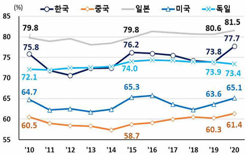 • 제조업 수출 대비 중·고위 기술군 제조의 수출 비중은 2020년 일본이 81.5%로 가장 높으며 한국 77.7%, 독일 73.4%, 미국 65.1%, 중국 61.4%의 비중을 차지함