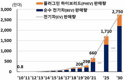 ※ 2030년 글로벌 전기자동차 판매 규모 : 현행 정책 시나리오(STEPS) 기준 2,750만대, 목표선언 시나리오(APS) 기준 4,000만대.