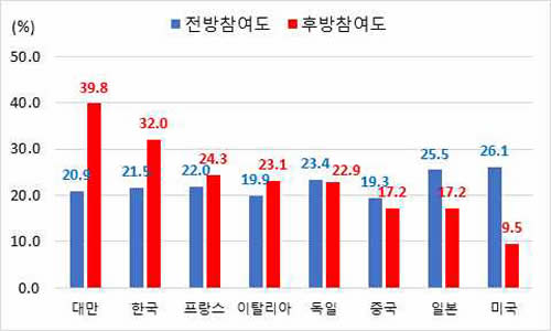 • 반면, 해외생산 중간재의 국내생산 투입 비중인 후방참여도는 대만이 39.8%, 한국 32.0%로 가장 크며 이는 글로벌 분업구조를 통한 제조업 부문의 성장이 지속된 것을 의미함