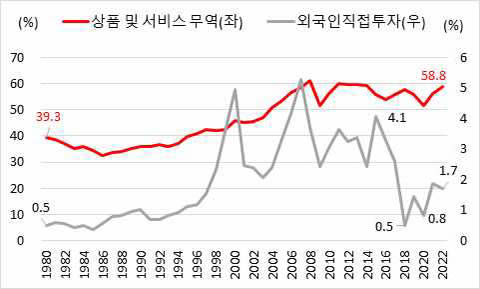 • 상품 및 서비스 무역 비중 역시 글로벌 금융위기 이후 크게 성장하지 못하고 50% 후반 수준을 등락하고 있음