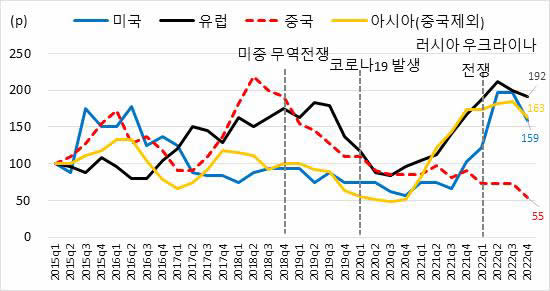 • 이에 반해 유럽의 외국인직접투자 지수는 2022년 4분기 기준 192p로 가장 큰 수준이며, 아시아 163p, 미국 159p를 기록함