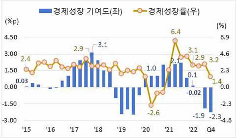 • 국내총생산(GDP) 대비 반도체·배터리 기업의 매출액 비중은 2020년 이후 7~10% 수준을 기록하고 있으며, 경제성장률 둔화 흐름과 함께 경제성장 기여도4) 역시 ’21년 2분기 2.1%p에서 ’22년 4분기 △2.3%p까지 하락함