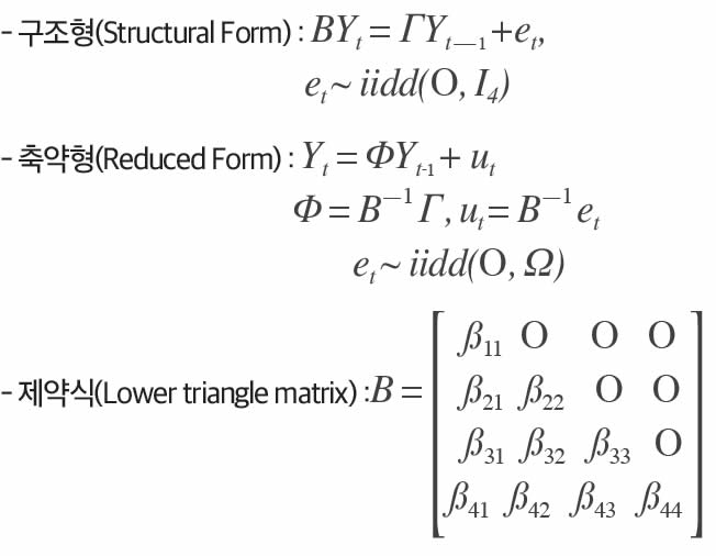 - 충격 반응 분석(Impulse Response Analysis)을 위해 축약형 방정식으로 변환 후 내생성과 외생성을 고려한 제약식(Lower triangle matrix) 구성