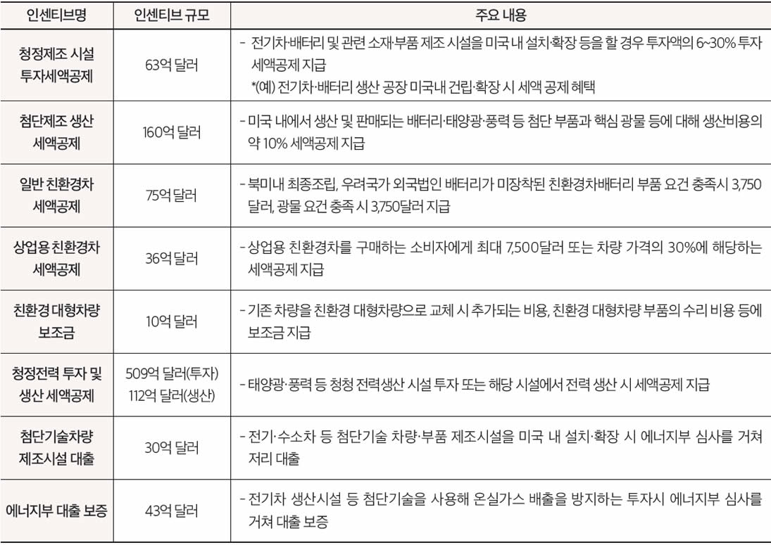 - 인플레이션감축법(IRA; Inflation Reduction Act) 제정을 통해 기후변화 대응 및 물가 안정화를 명분으로 첨단산업에 대한 생산 및 투자 촉진 방안을 공표