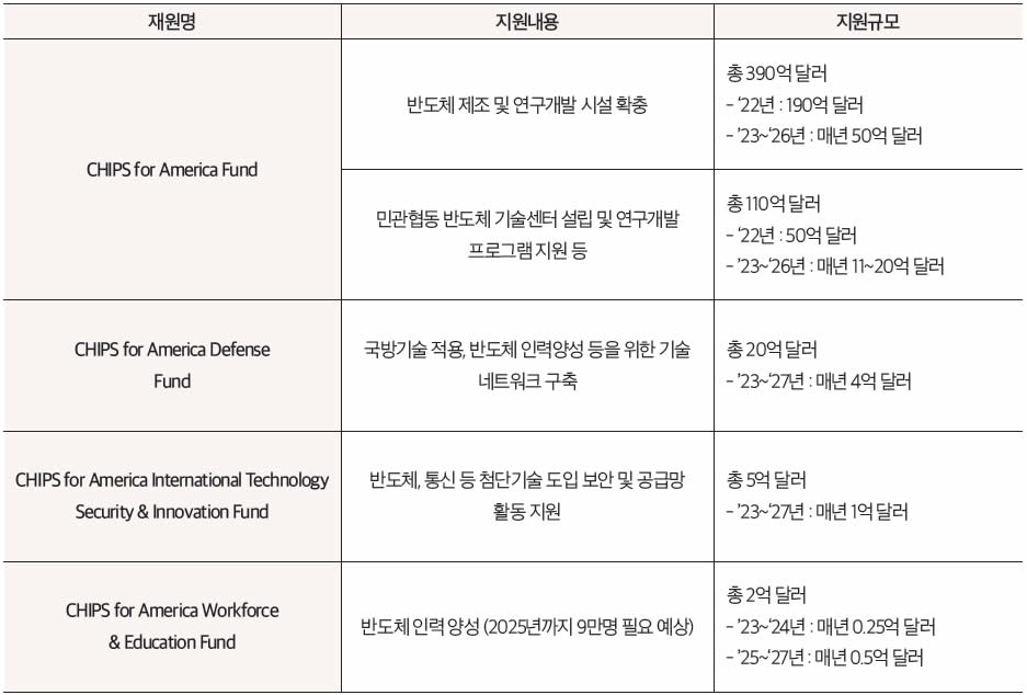 - 기존 법안의 조정을 통해 미국 내 반도체 제조 및 연구개발 역량 육성을 위한 세부적인 투자 계획을 담은 반도체·과학법(CHIPS and Science Act)제정5)