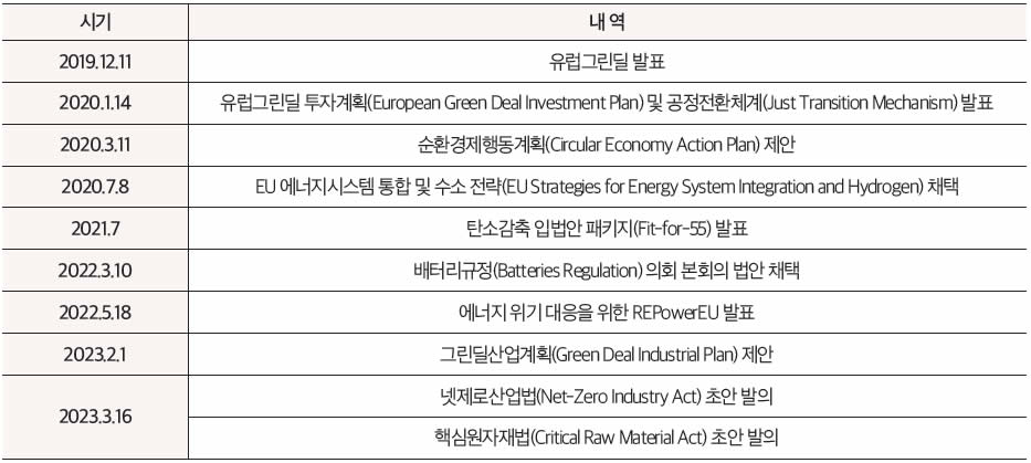 - 유럽그린딜 목표 달성의 일환으로 그린딜 산업계획(Green Deal Industrial Plan)을 제안하여 친환경 산업 육성 및 주요국 정책 대응방안을 모색