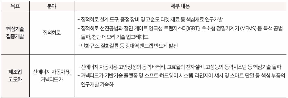 • 차세대 반도체 기술 분야에 대한 연구개발(R&D) 투자를 확대하고 반도체기금을 조성하여 기업의 생산 및 혁신 활동을 지원