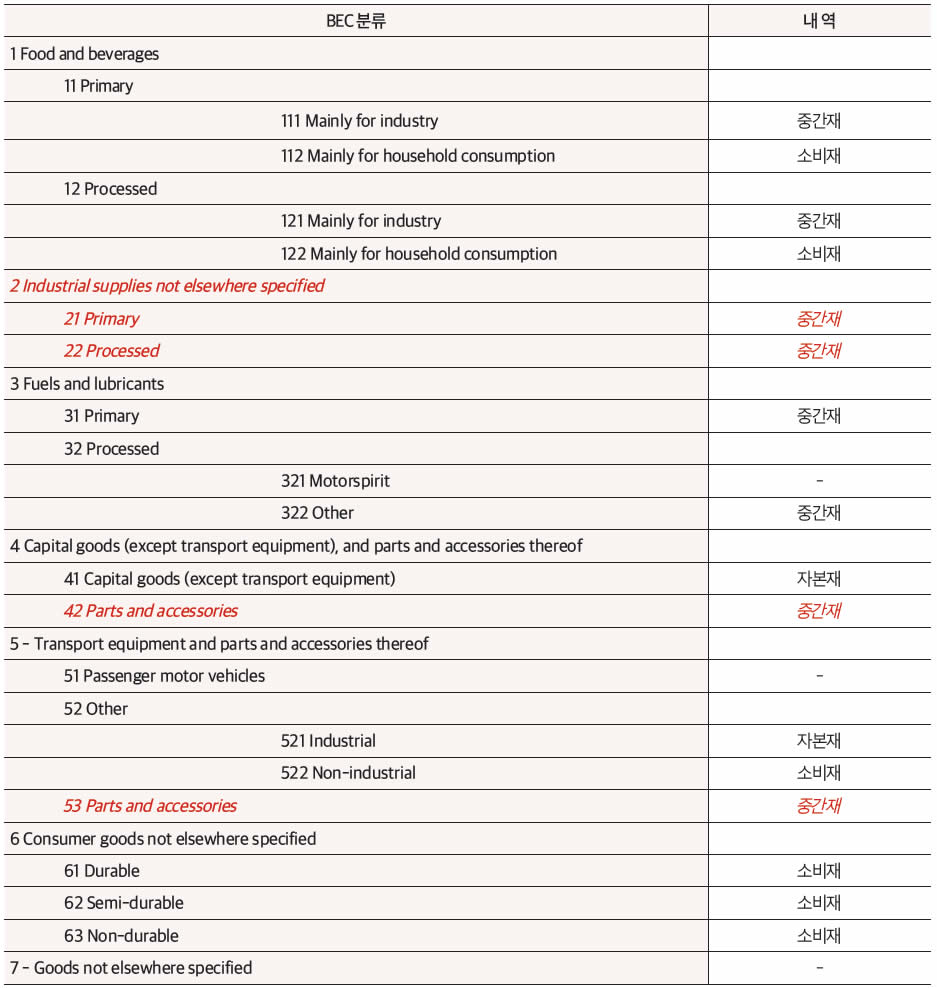 3) ① 2 Industrial supplies not elsewhere specified, ② Capital goods (except transport equipment), and parts and accessories thereof - 42 Parts and accessories, ③ 5 Transport equipment and parts and accessories thereof - 53 Parts and accessories 코드 합산 기준임. 코드 분류 <참조 3> 참고.
