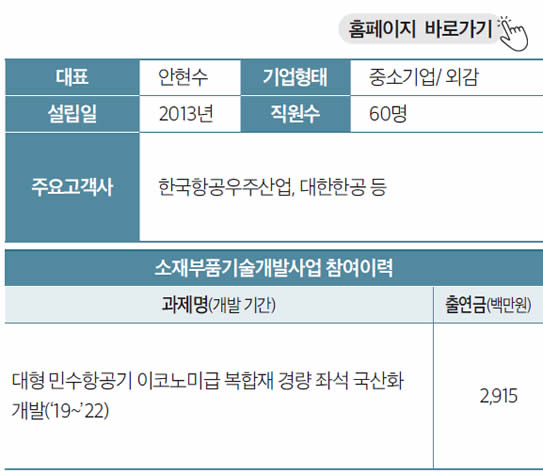 이어서 산업통상자원부 사업, 소재부품기술개발(R&D)에 참여한 기업 중 “우주·항공” 분야의 기술 우수 기업을 살펴보고자 합니다. 해당 기업과 컨택을 희망하시는 분은 아래로 연락주시기 바랍니다.