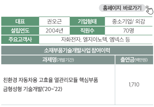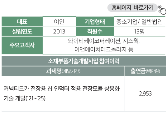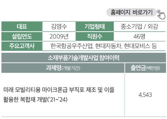 그간 KITIA VIP Report에서는 반도체·디스플레이, 이차전지, 수소, 우주항공 기업을 소개해드렸고, 많은 관심을 가져주셨었습니다. 이어서 산업통상자원부 사업, 소재부품기술개발(R&D)에 참여한 기업 중 “첨단 모빌리티” 분야의 기술 우수 기업을 살펴보고자 합니다. 해당 기업과 컨택을 희망하시는 분은 아래로 연락주시기 바랍니다.