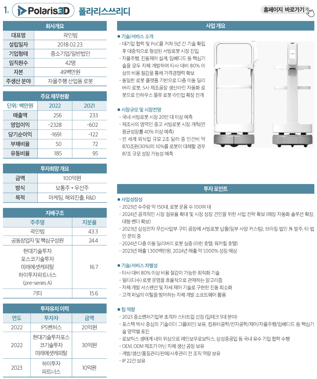 | 1 | 폴라리스쓰리디 | 자율주행 산업용 로봇 | 100억원 | 보통주·우선주 |