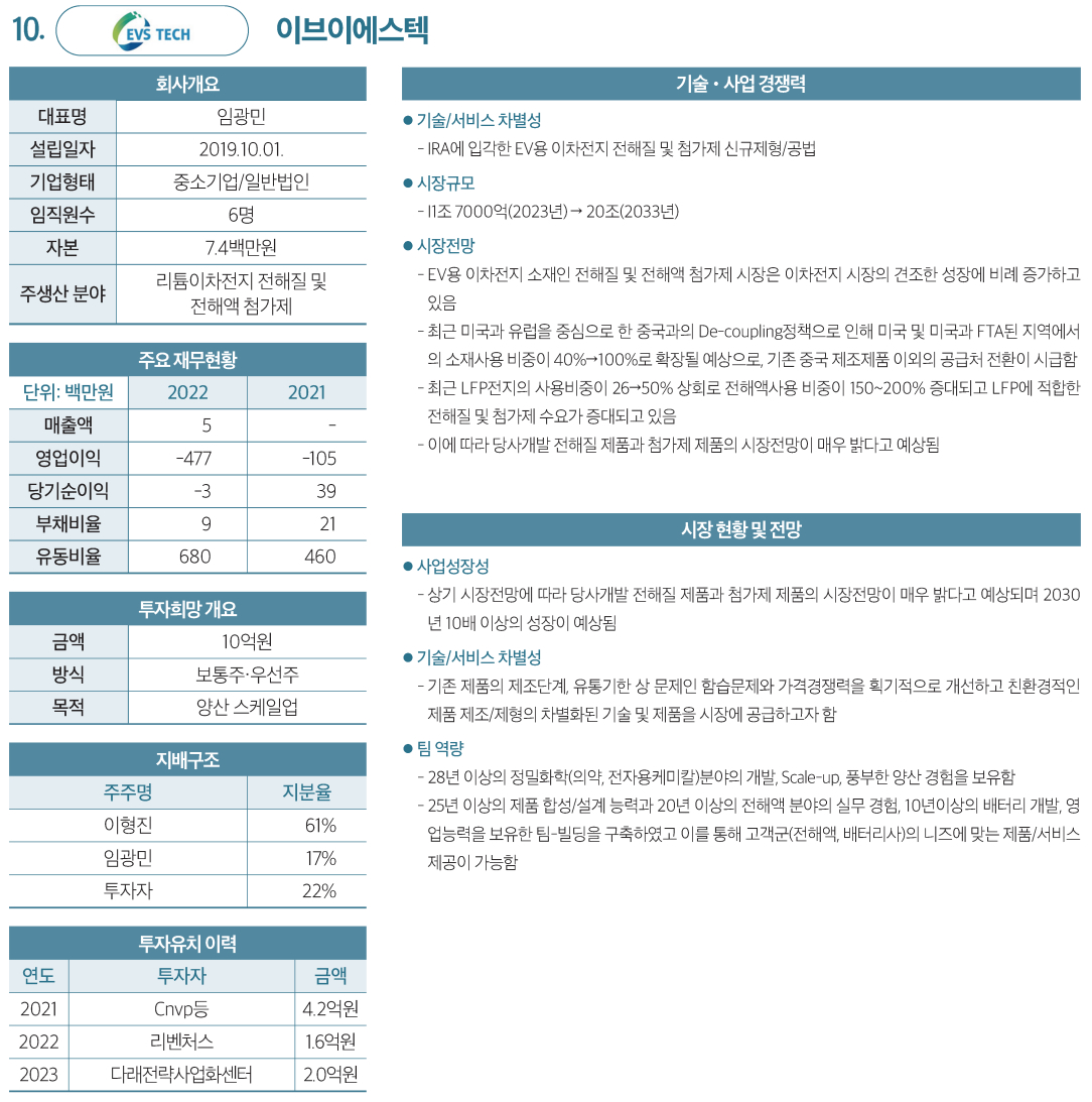 | 10 | 이브이에스텍 | 리튬이차전지 전해질 및 전해액 첨가제 | 10억원 | 보통주 |