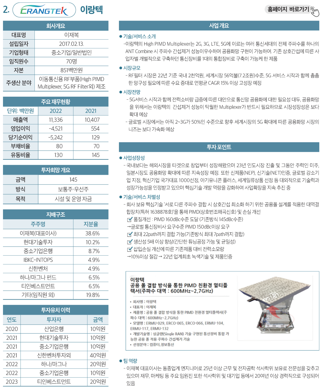 | 2 | 이랑텍 | 이동통신용 RF부품 제조 | 50억원 | 보통주·우선주 |