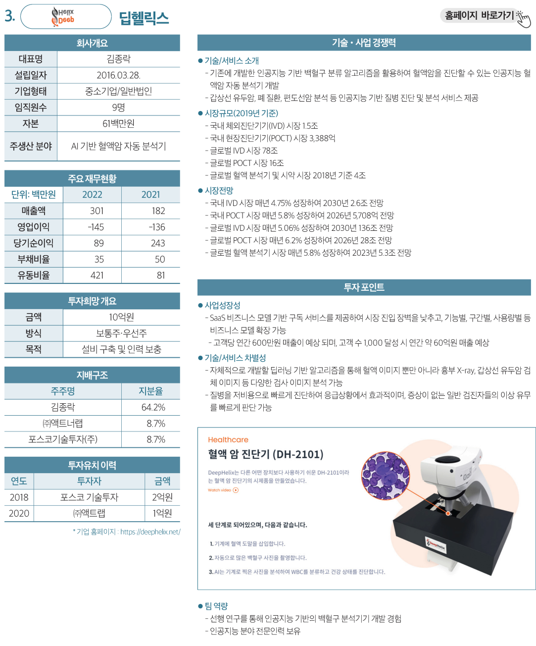 | 3 | 딥헬릭스 | AI 기반 혈액암 자동 분석기 | 10억원 | 보통주·우선주 |