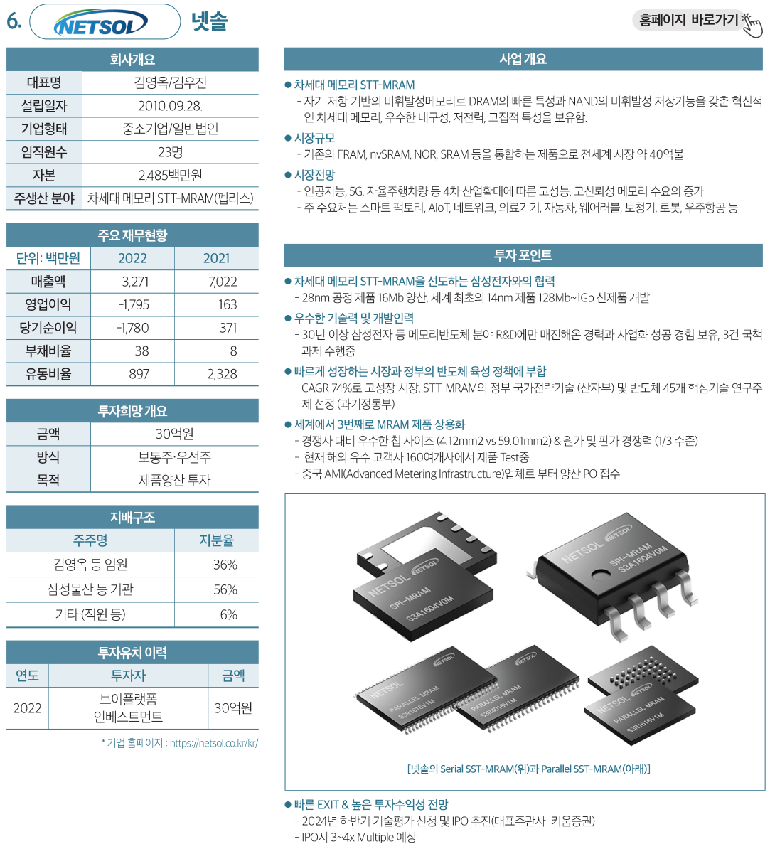 | 6 | 넷솔 | 차세대 메모리 STT-MRAM | 30억원 | 보통주·우선주 |