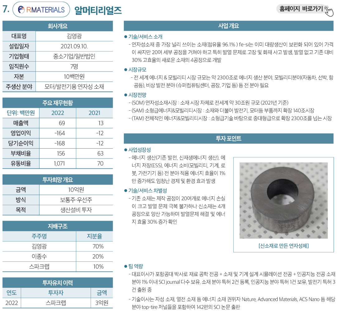 | 7 | 알머티리얼즈 | 모터/발전기용 연자성 소재 | 10억원 | 보통주·우선주 |