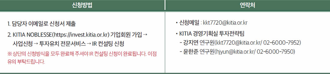 투자유치 및 협상 경험이 부족한 기업에 전략수립, 비즈니즈 모델 구축 등 투자유치에 필요한 맞춤형 지원을 통해 기업의 투자유치 역량강화 및 투자 네트워킹 촉진