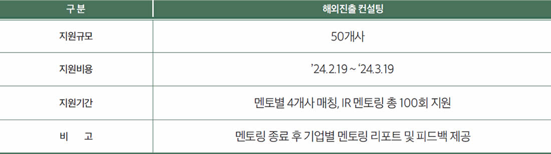 희망 진출국가 추천, 전략적 투자자 매칭 등 맞춤형 해외진출 컨설팅 지원