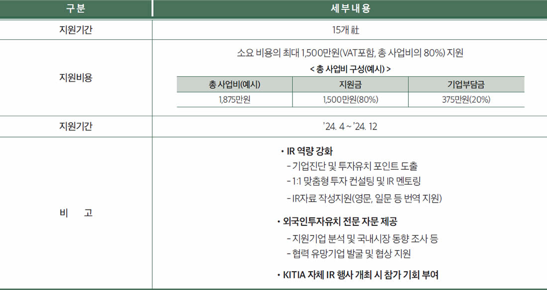 투자유치를 위한 기업 소개자료(IR 자료 등) 작성, 해외투자유치전략 수립 지원 등