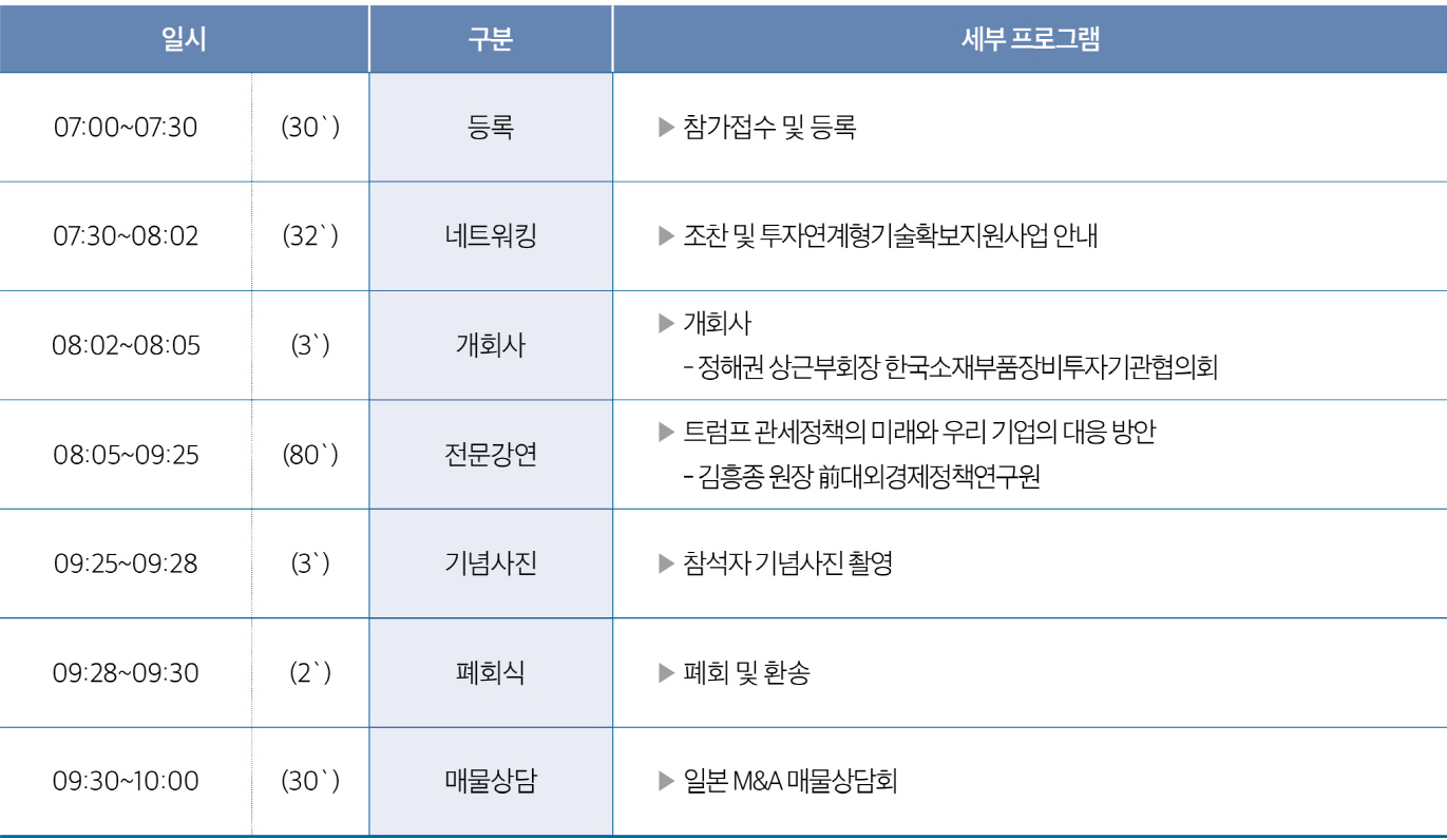 - 글로벌 공급망 재편과 한국의 FDI 전략, 반도체·배터리 등 주요분야 투자전략 공유, 유망 韓 소부장기업과 해외 재무투자자 間 1:1 투자상담 제공 등 글로벌 소부장 네트워크 場 마련 |