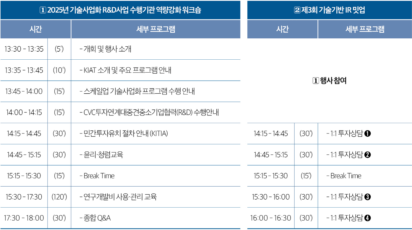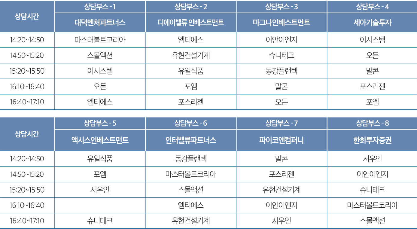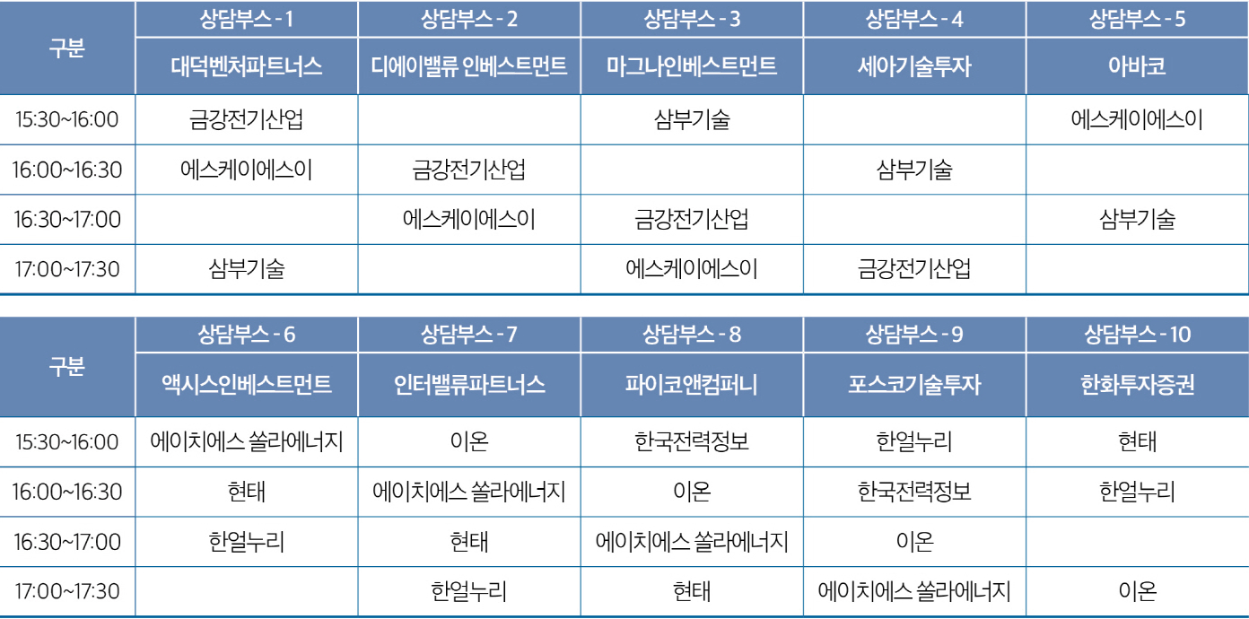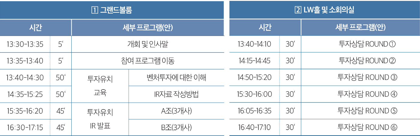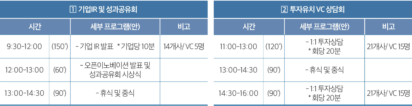 ① 기업IR 및 성과공유회 ② 1:1 투자상담회 실시 |