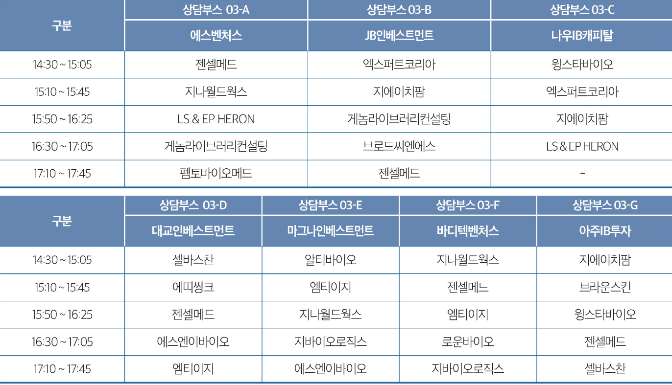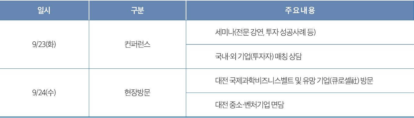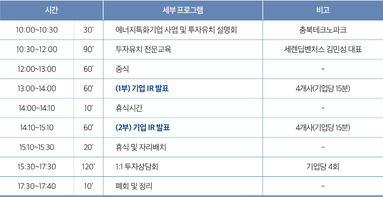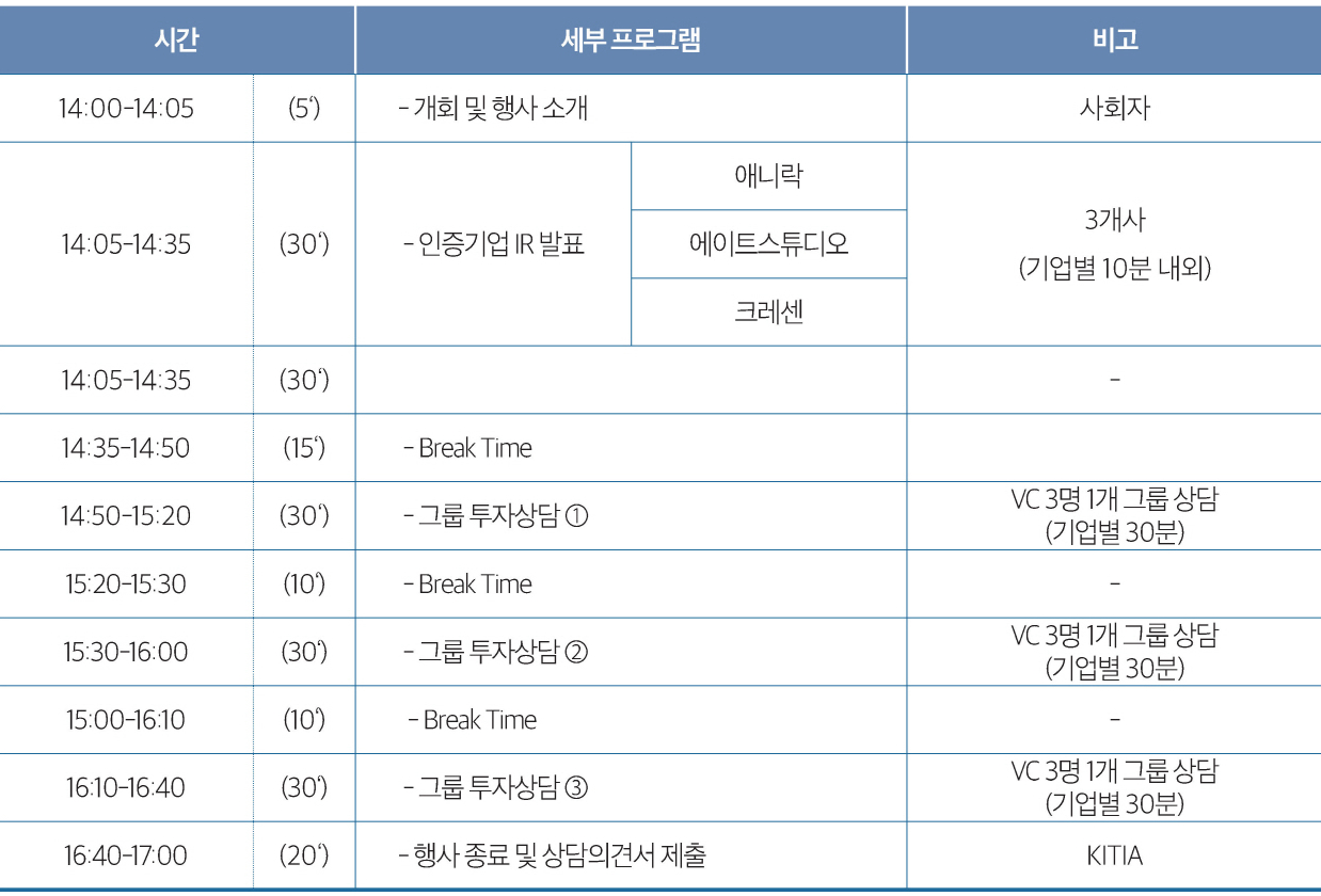 ① 기업IR 및 성과공유회 ② 1:1 투자상담회 실시 |