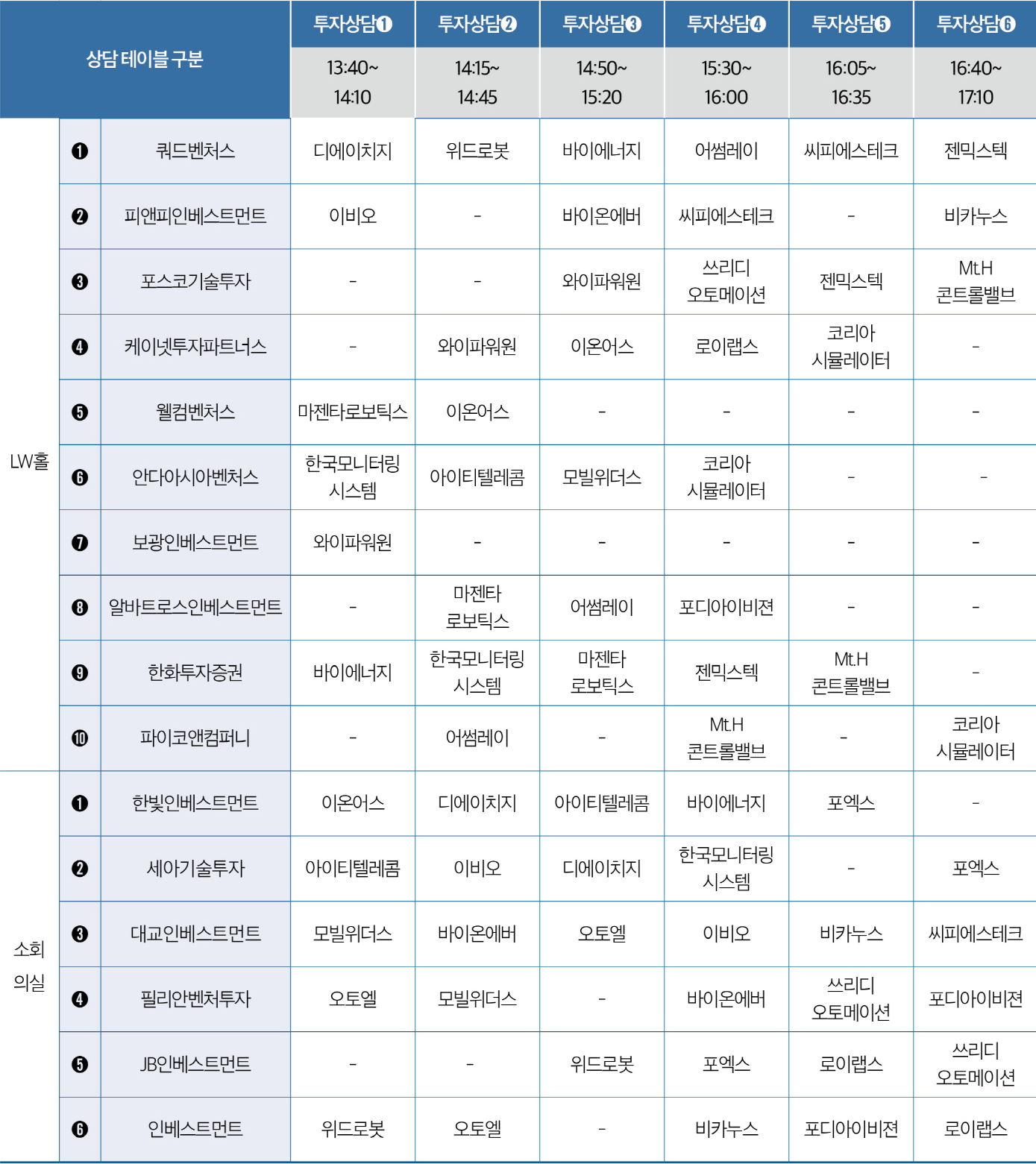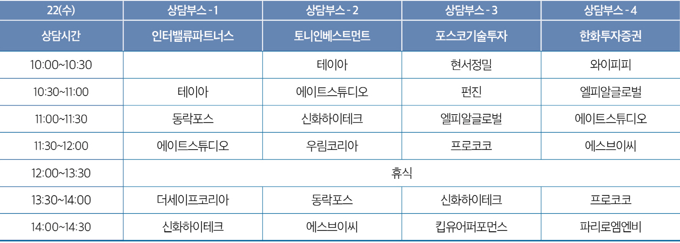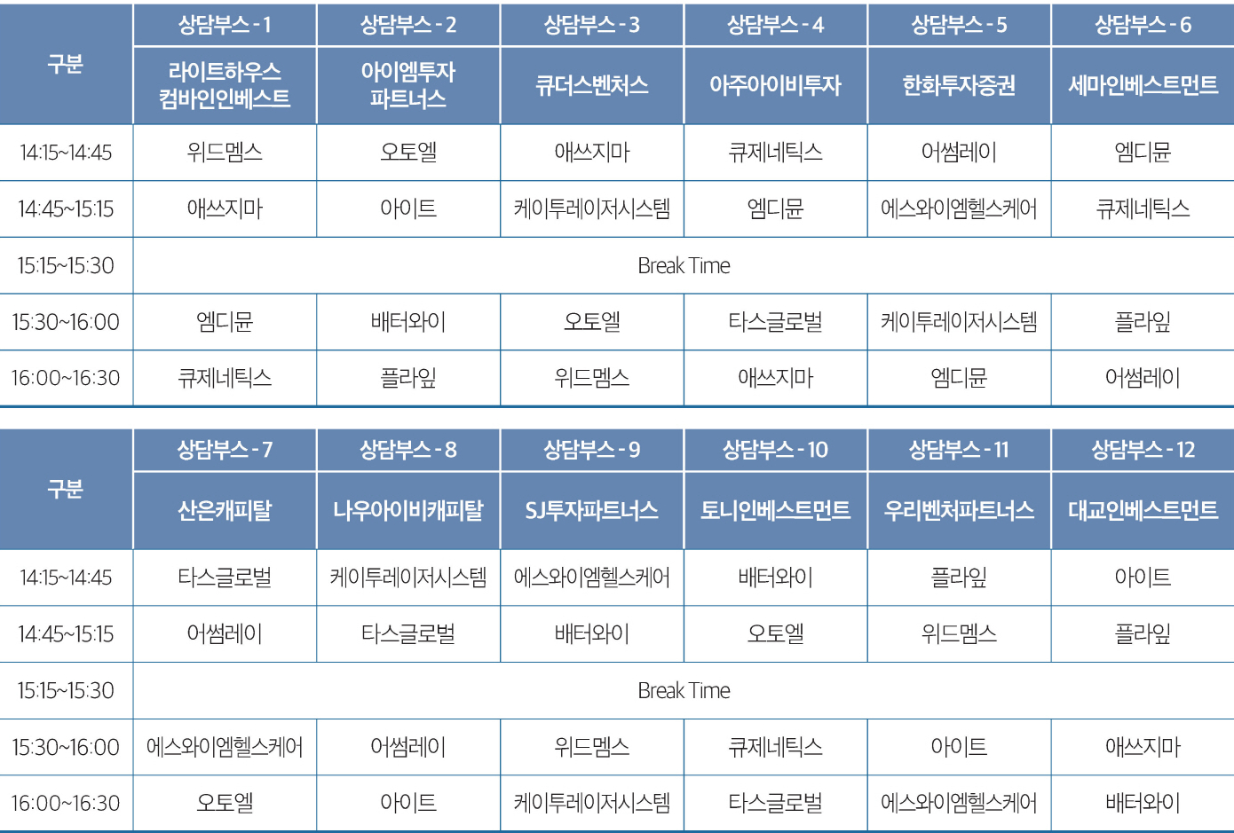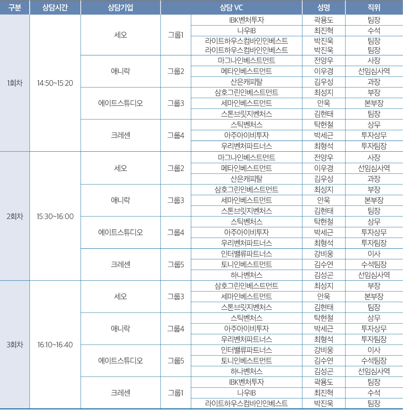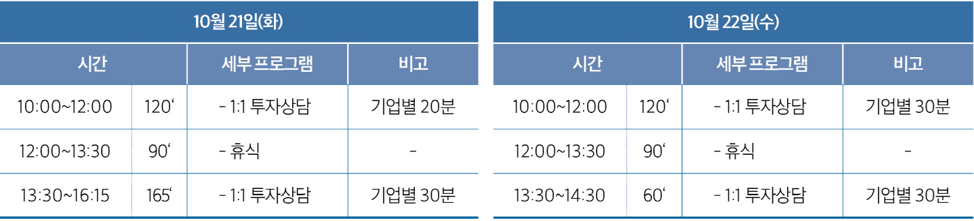 - (국내IR) 투자유치 희망기업 IR 발표 및 투자심사역과 1:1 투자상담