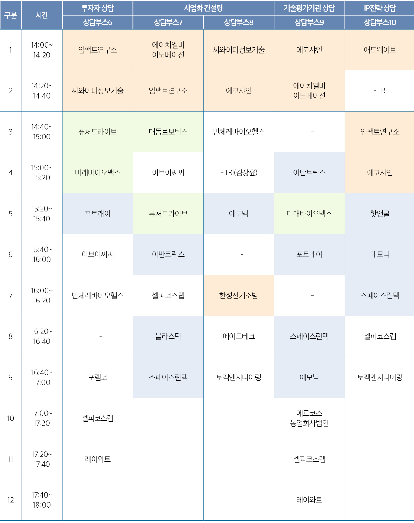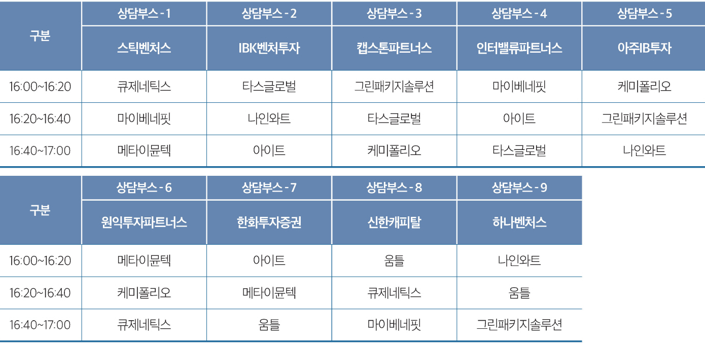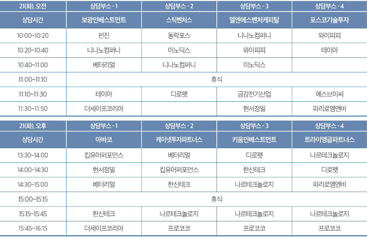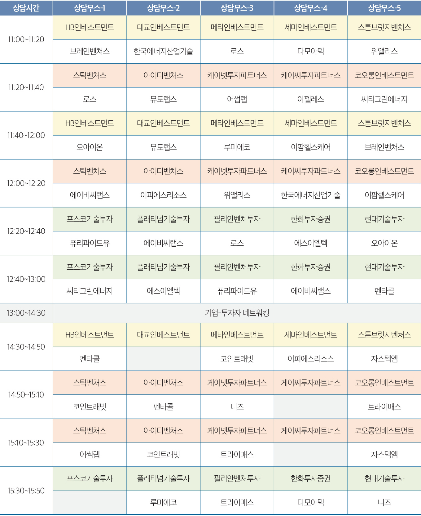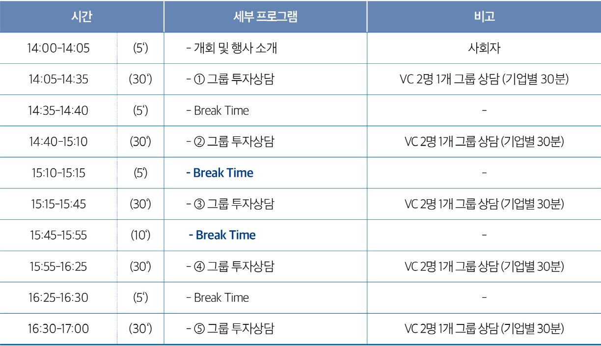 - (국내IR) 투자유치 희망기업 IR 발표 및 투자심사역과 1:1 투자상담