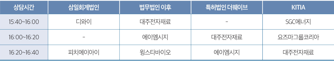 - 참여 심사역 대상 상담 희망기업 사전조사 통한 1:1 매칭
