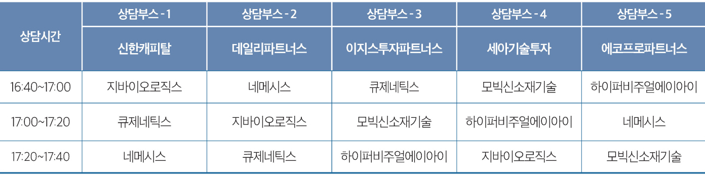 • 후속 상담 투자기관-관심기업간 통한 후속 투자상담 지원