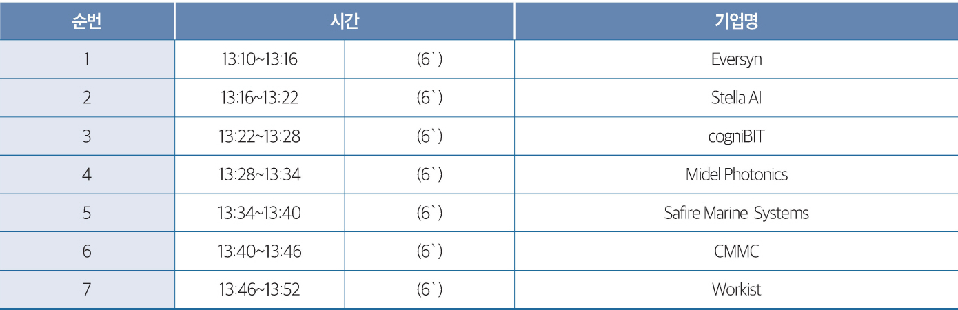 각 기업별 6분 IR 피칭 진행(발표 3분 / 순차통역 3분) |