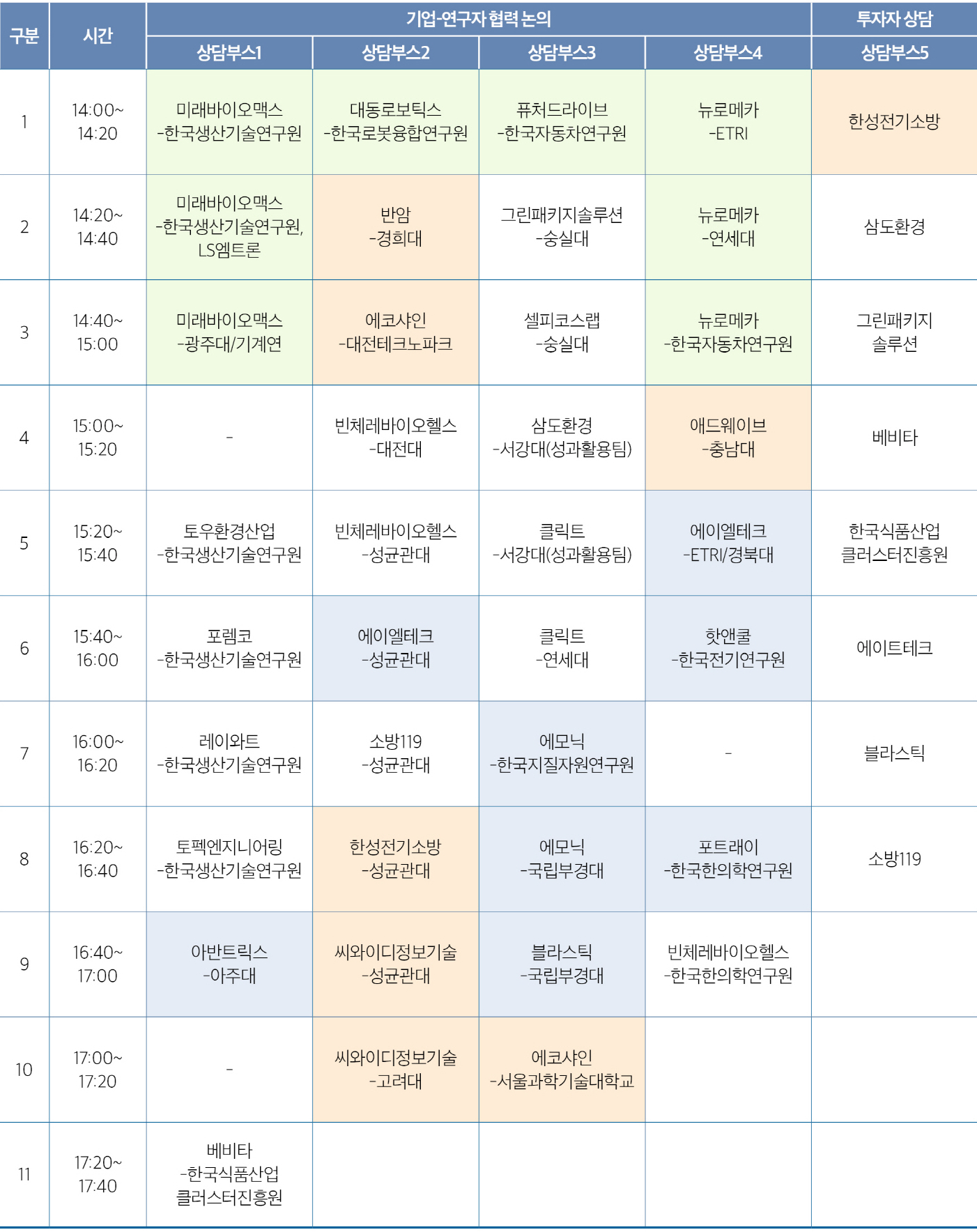 • 주요내용 | 기업의 수요기술 브리핑(기업→연구자), 기업-연구자 간 협력방안 논의, 기업∙연구자 대상 상담부스 운영 |