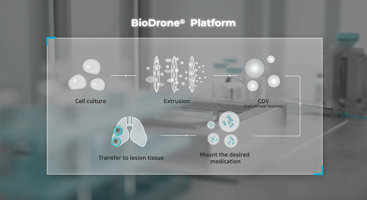 바이오드론 기술은 원하는 조직으로 약물을 전달하는 약물전달 플랫폼이다. 압출공정기술(1)을 통해 CDV를 생산하고 원하는 약물을 탑재(2)해 암조직으로 표적화하는 기술(3)을 적용하여 약물의 효과를 증대시키고 부작용을 최소화할 수 있다. 이는 암을 비롯한 난치질환에서도 치료 효과를 극대화할 수 있다. 유전자 치료제 개발에는 반드시 약물 전달기술이 필요하기 때문에 글로벌 제약 바이오 기업들의 관심이 뜨겁다. 이러한 플랫폼 기술은 백신, 항암제, 그리고 다른 난치질환 치료에도 적용할 수 있다.