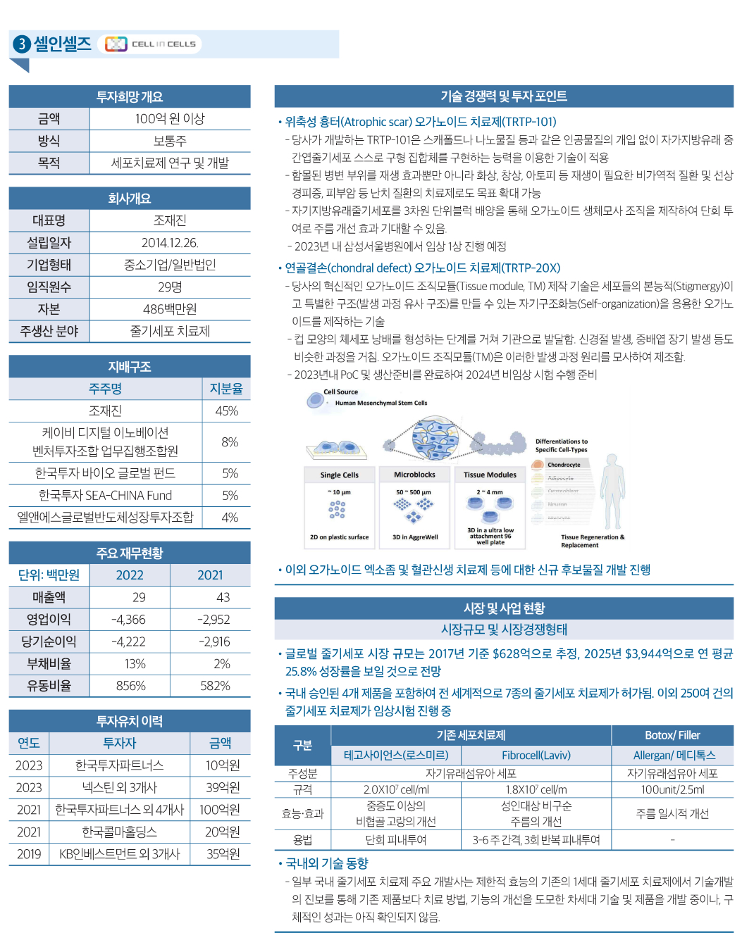 3 셀인셀즈 줄기세포 치료제 100억 원 이상 보통주