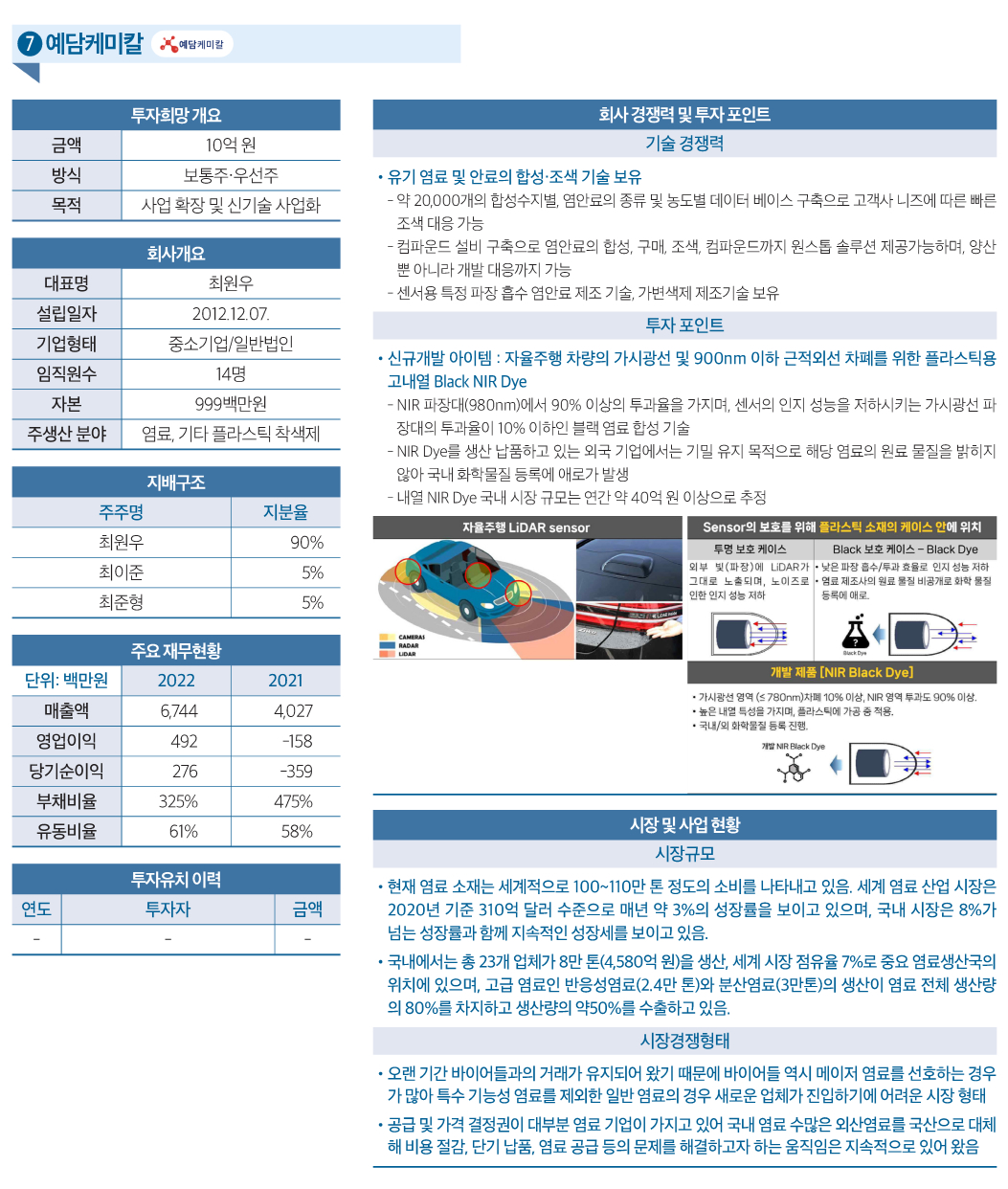 7 예담케미칼 염료, 기타 플라스틱 착색제 10억 원 보통주·우선주